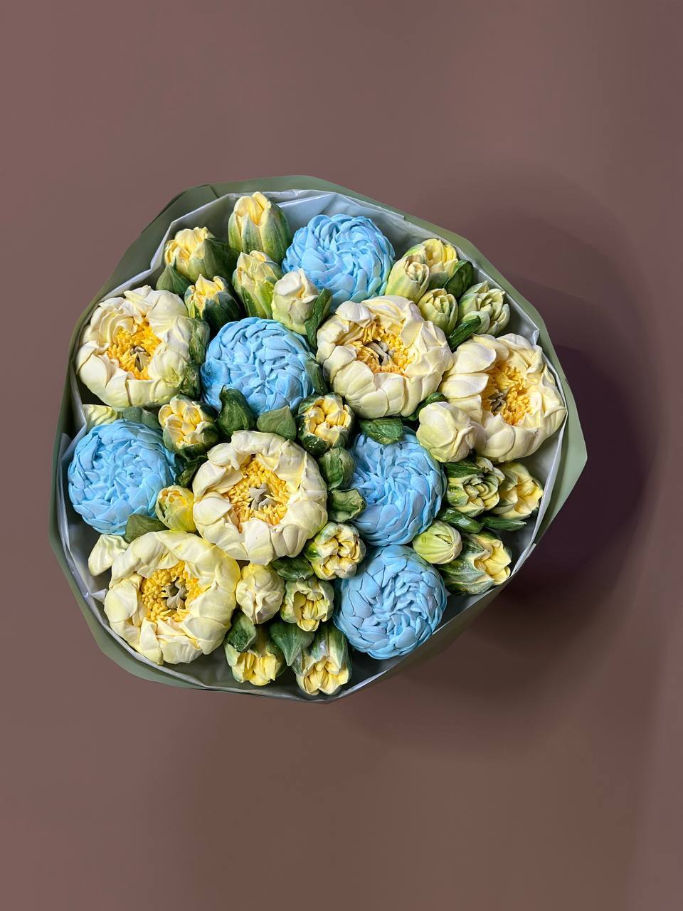 Мікс жовтих півоній та блакитних гортензтй